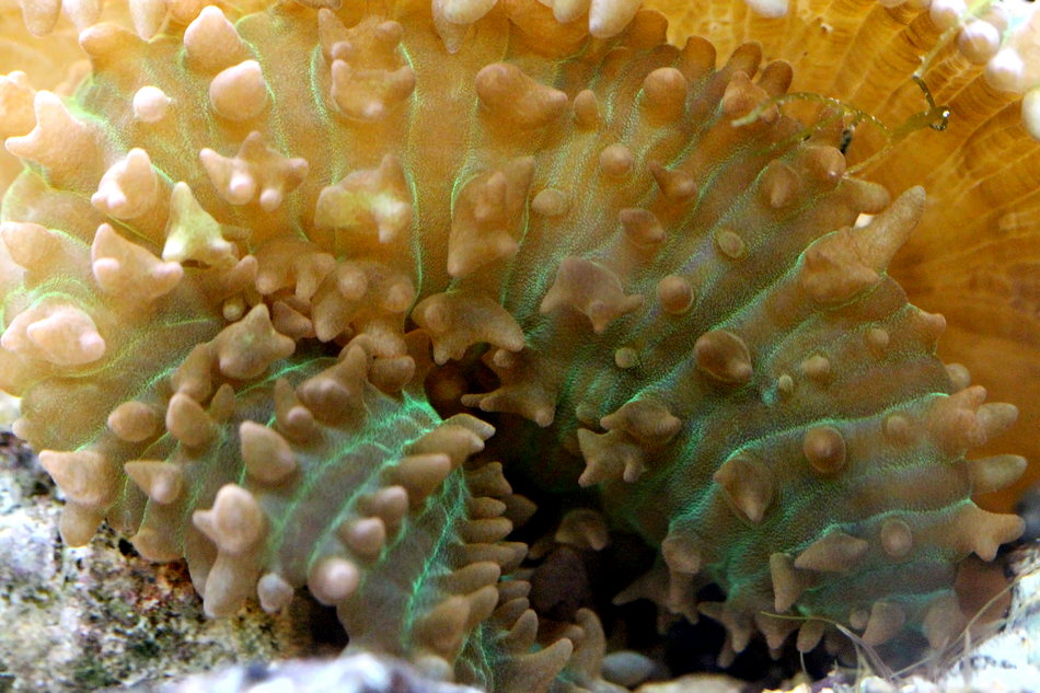 Die Blasenkoralle – Physogyra habe ich schon länger im Becken, aber irgend wie kommt sie nicht so richtig in Schwung. Sie sieht gut aus, aber wird nicht deutlich größer bzw. bildet kaum neue Korallenköpfe. Wahrscheinlich habe ich nicht die besten Bedingungen für die Blasenkoralle.