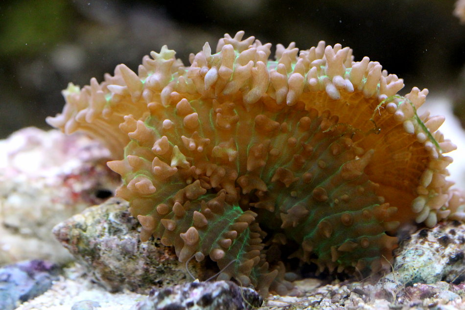 Diese Scheibenanemonen (Rhodactis sp.) hatte ich vor vielen Jahren. Damals vermehrten sie sich recht stark und bildeten stattliche Exemplare sowohl größenmäßig als auch optisch. Sie sahen wirklich toll aus. Ich verschenkte einige Exemplare an meinen Bruder und gestaltete später mein Becken technisch und im Besatz um. Durch diese extremen Veränderungen gefiel es diesen Scheiben in meinem Becken nicht mehr und sie verschwanden nach und nach vollständig. Nach vielen Jahren bekam ich jetzt von meinem Bruder einige „meiner“ Exemplare bzw. deren Kinder zurück. Jetzt scheint es ihnen auch in meinem Becken wieder zu gefallen.