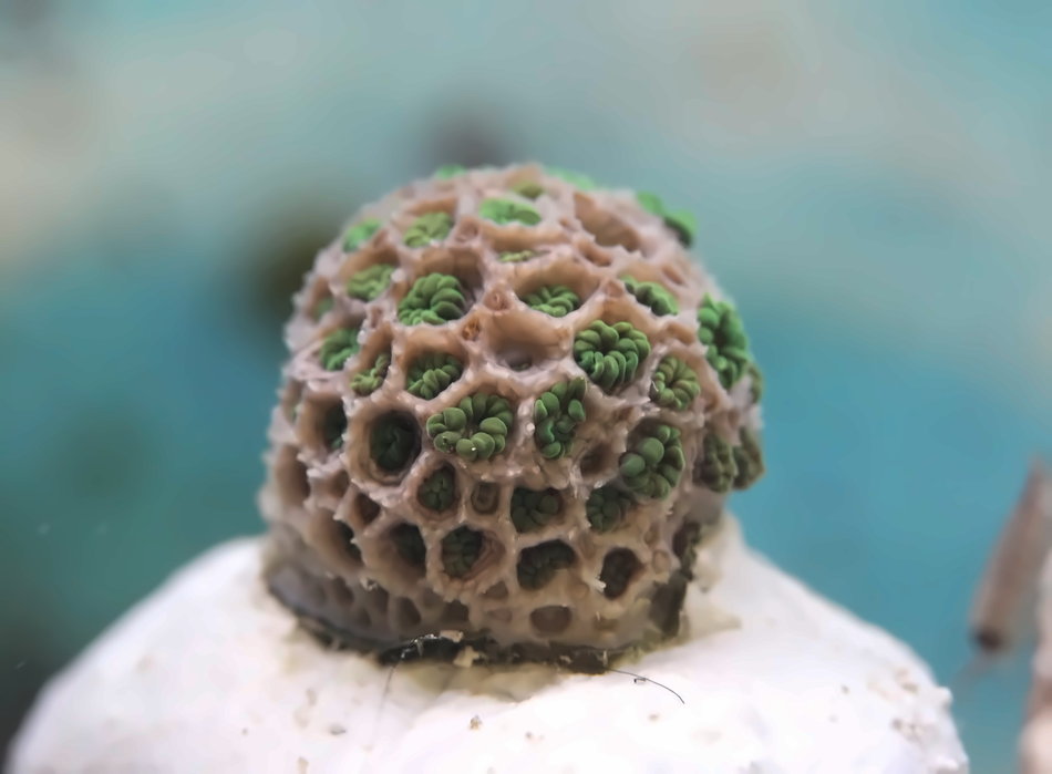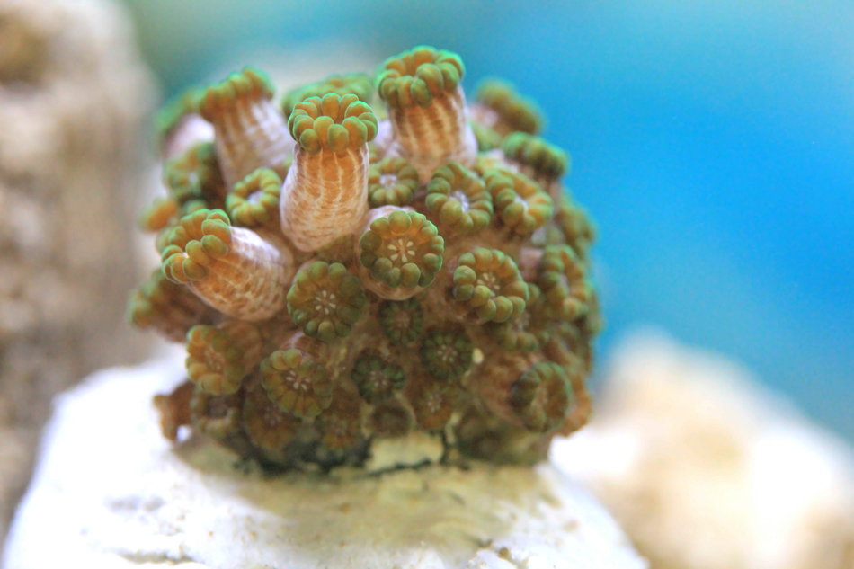 Diese winzige Alveopora Margeritenkoralle in grün gehört ebenfalls zu meinen Neuerwerbungen. Das Foto mit den Koralliten zeigt die Alveopra kurz nach dem Aufkleben. Einen Tag später schauen langsam die Polypem heraus.