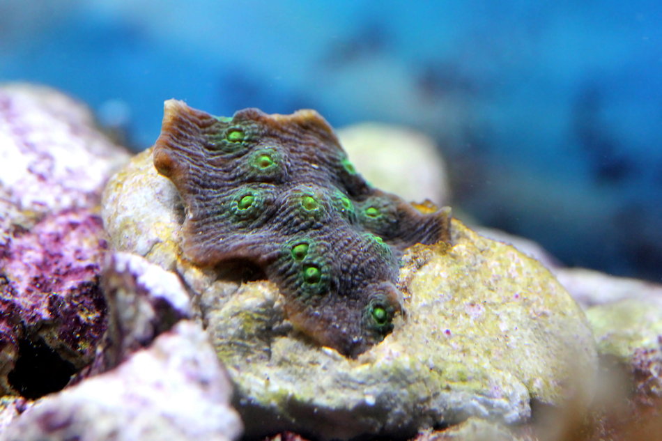 Das kleine grüne Keniabäumchen (Capnella sp.) gehört ebenfalls zu meinen Neuerwerbungen. Es war auf einem Fragmenthalter aufgeklebt. Da diese Stöpselartigen Halter sich nicht gut im Aquarium integrieren lassen, habe ich den Halter entfernt und das Keniabäumchen mit einem Gummi auf einem kleinen Riffstein befestigt. Ich hatte die Hoffnung, dass sich das Keniabäumchen dort mit der Zeit selbt befestigt, was leider nicht geklappt hat. Es ist aktuell leider verschwunden. Möglicherweise hat es mein Pfaffenhutseeigel als Deko mitgenommen und dann an irgend einer nicht einsehbaren Stelle verloren. Ich hoffe, dass hübsche grüne Bäumchen taucht irgend wann noch mal auf 🙁