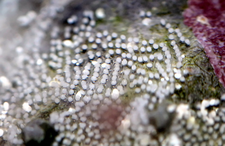 Es dauert nicht allzu lange und schwups saßen beide Nassarius wieder auf der großen Astralium Sternschnecke bzw. auf deren Gehäuse. Jetzt guckte ich doch genauer hin und erkannte den harmlosen Grund. Die beiden Nassarius hatten auf dem Gehäuse der Sternschnecke abgelaicht und auch ein paar Eier an der Scheibe angebracht. Da diese Schnecken Zwitter sind, brauchte es beide um gegenseitig den Laich zu befruchten. Junge Schnecken werde ich leider nicht herabziehen können, denn es werden später Larven schlüpfen, die planktonisch leben. Darauf warten nur alle Planktonfresser im Becken und so wird vom emsigen Treiben keiner die Entwicklung zur Jungschnecke schaffen. Das ist leider nicht zu ändern, aber trotzdem alles interessant zu beobachten.