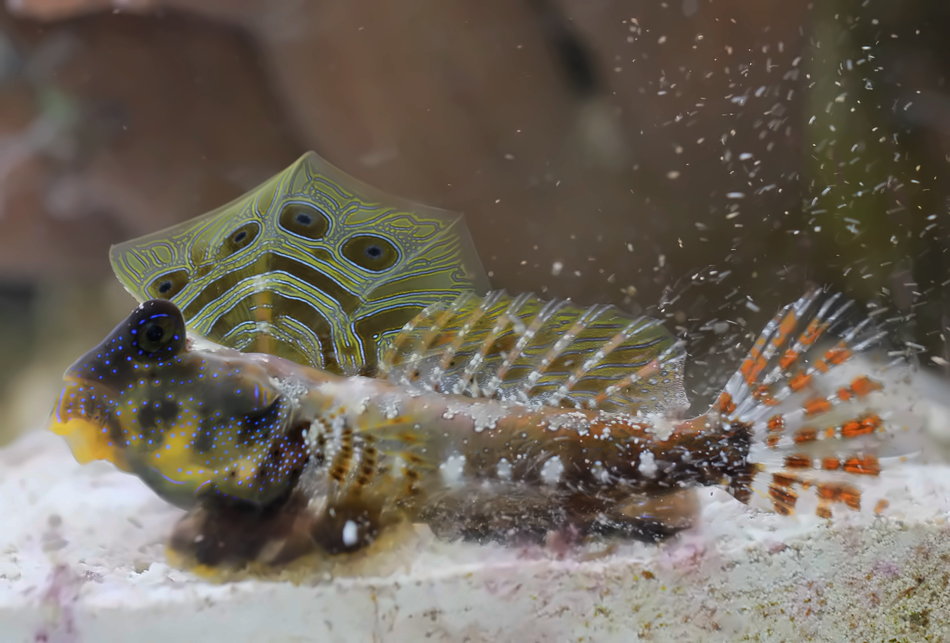 Mein Augenfleck Mandarinfisch (Neosynchiropus ocellatus) ist leider verschwunden. Ich habe ihn schon ein paar Tage nicht mehr gesehen. Das bedeutet er ist gestorben. In einem Meerwasseraquarium leben sehr viele Tiere, die auch verstorbene Tiere in relativ kurzer Zeit verwerten, so dass man von diesen keinerlei Reste mehr findet. Sehr schade um mein hübsches Männchen, der so schön seine wunderschöne Rückenflosse aufstellen konnte. Der Mandarinfisch war jetzt 3 Jahre in meinem Becken. Da er aber bereits beim Kauf kein Jungtier mehr war, wird er wohl sein mögliches Alter erreicht haben.
