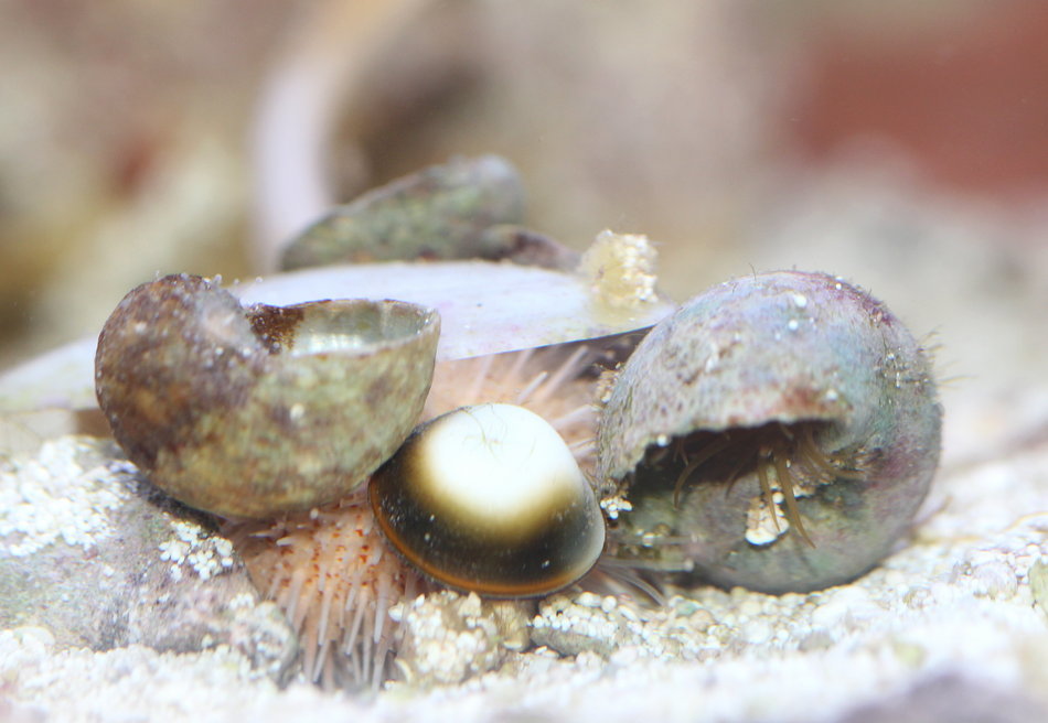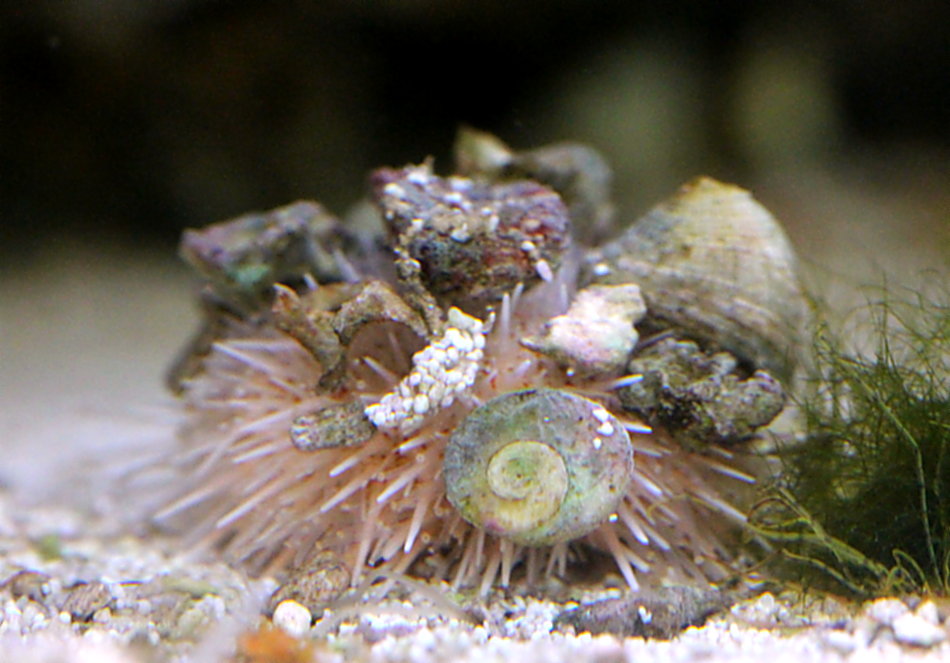 Leider werden Kalkrotalgen gern auch von manchen Seeigeln abgeraspelt und gefressen. Da ich einen Pfaffenhut Seeigel im Becken habe, gelingt es nicht, alle Steine erfolgreich von Kalkrotalgen bewachsen zu lassen. Der Pfaffenhut Seeigel ist jedoch recht nützlich und bereichert die Artenvielfalt im Becken.