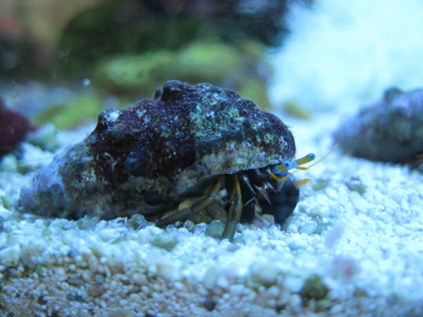 Einsiedler mit blau-orangen Stielaugen und großen schwarz-weißen Scheren