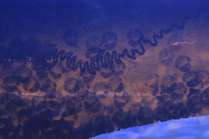 Frassspuren an der Rückwand von Fischen und Schnecken (Algenfresser).