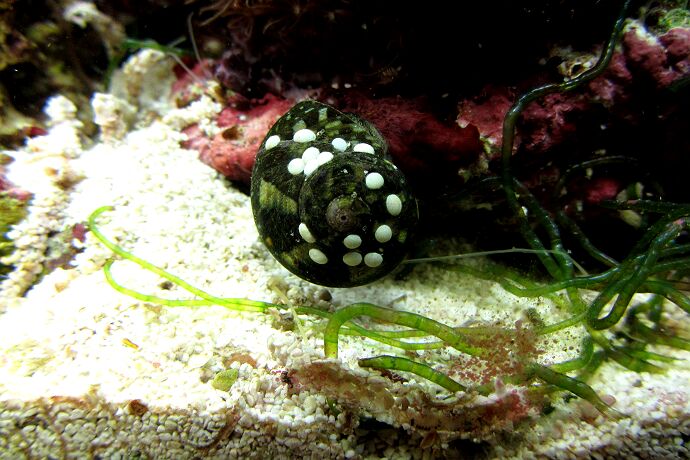 Diese Schnecke hat an ihrem Gehäuse Eier kleben. Sind wahrscheinlich von einer Neria Napfschnecke.