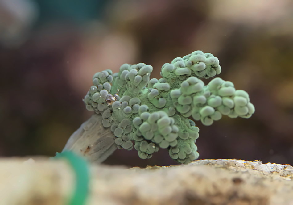 Das kleine grüne Keniabäumchen (Capnella sp.) gehört ebenfalls zu meinen Neuerwerbungen. Es war auf einem Fragmenthalter aufgeklebt. Da diese Stöpselartigen Halter sich nicht gut im Aquarium integrieren lassen, habe ich den Halter entfernt und das Keniabäumchen mit einem Gummi auf einem kleinen Riffstein befestigt. Ich hatte die Hoffnung, dass sich das Keniabäumchen dort mit der Zeit selbt befestigt, was leider nicht geklappt hat. Es ist aktuell leider verschwunden. Möglicherweise hat es mein Pfaffenhutseeigel als Deko mitgenommen und dann an irgend einer nicht einsehbaren Stelle verloren. Ich hoffe, dass hübsche grüne Bäumchen taucht irgend wann noch mal auf 🙁