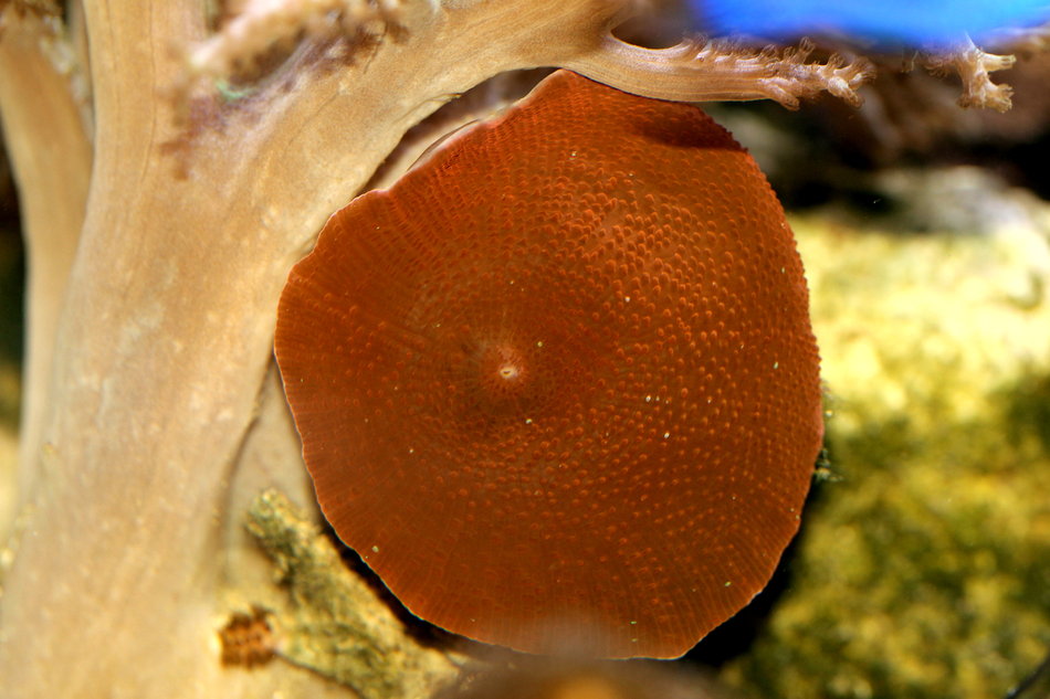 Die Rote Scheibenanemone (Discosoma sp.) saß monatelang auf einem breiten Ast einer Sinularia Weichkoralle. Jetzt ist sie auf Wanderschaft gegangen und sucht sich einen neuen Platz. Den Grund kenne ich nicht, da ich im Becken nichts verändert habe.